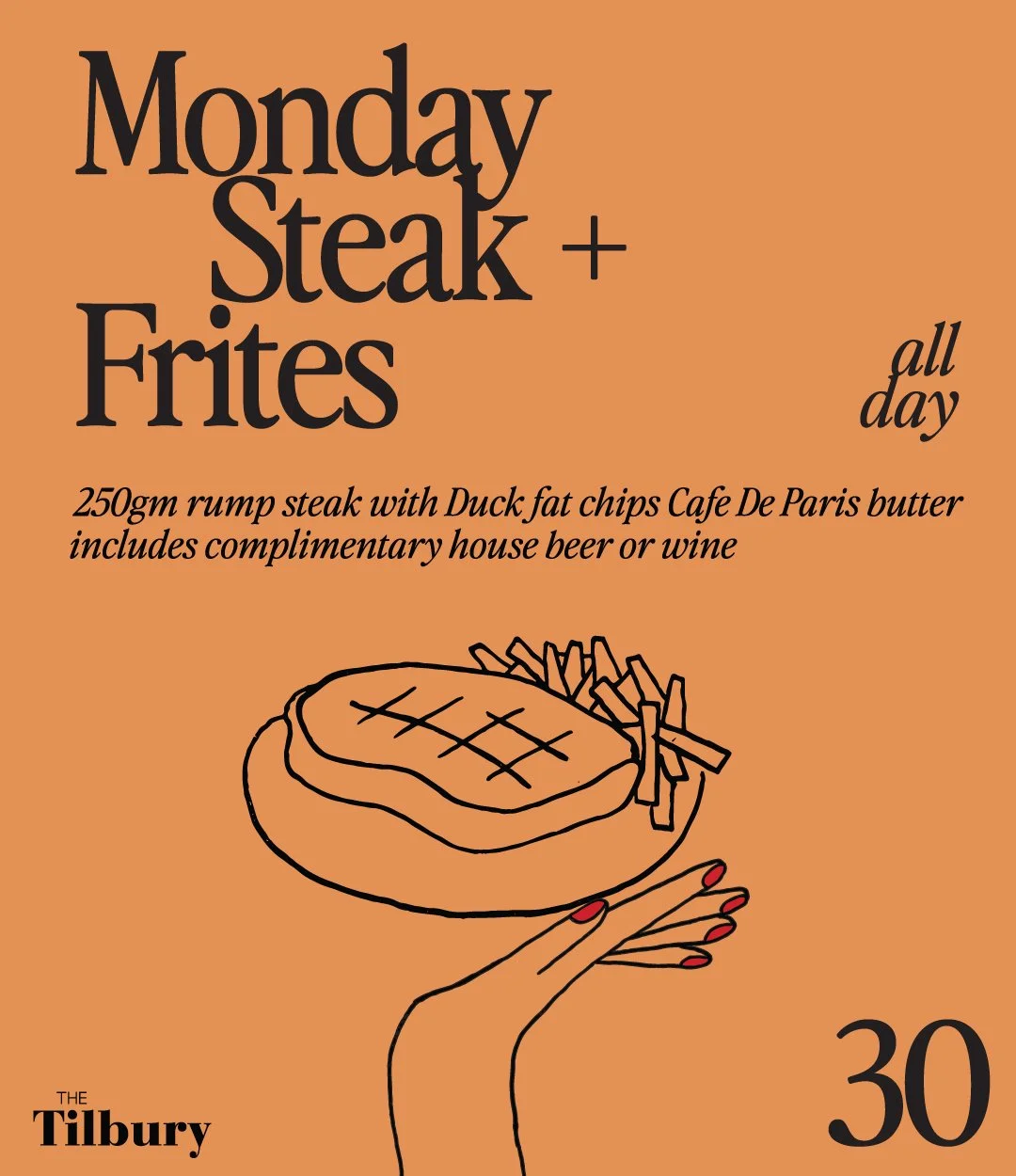with Monday Steak + Frites at The Tilbury. Enjoy a 250g rump steak with duck fat chips and Café de Paris butter, served with a complimentary house beer or wine — all day for $30.
